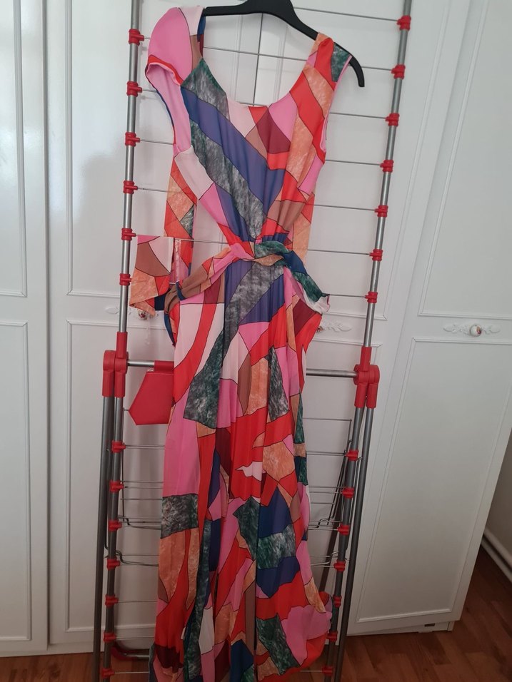 Sırtı açık, bol kesim ve dökümlü tasarıma sahip çok renkli, uzun kadın elbisesi. Yumuşak sentetik kumaştan yapılmış, bohem ve avangard tarzda, parti için uygun.