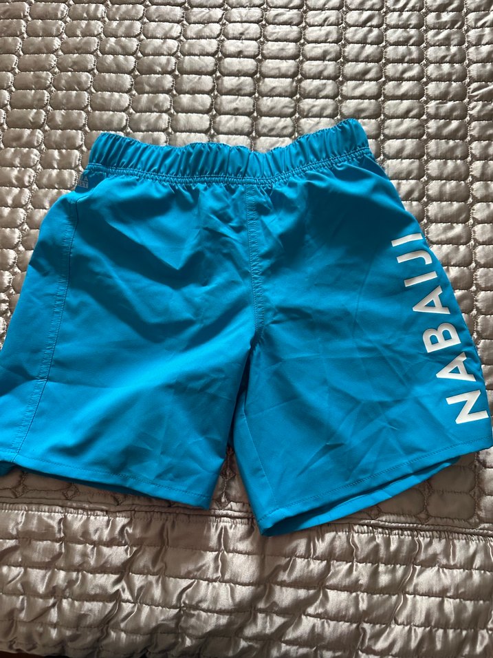 Parlak mavi renkte, elastik bel bantlı, sade tasarımlı, midi uzunlukta ve sıkı kesim çocuk mayo şortudur. Yanında 'NABAIJI' yazısı bulunur. Decathlondan alındı etiketi üzerindedir.