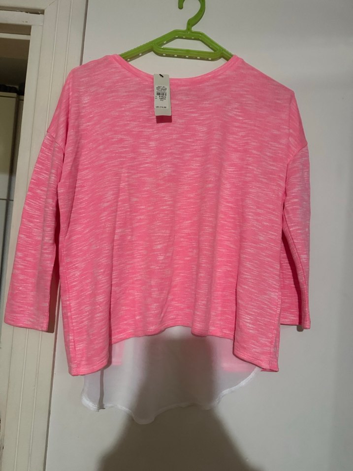 , uzun kollu ve yuvarlak yakalıdır. Pastel pembe yumuşak sentetik kumaştan, dantel detaylı ve bol kesimdir.