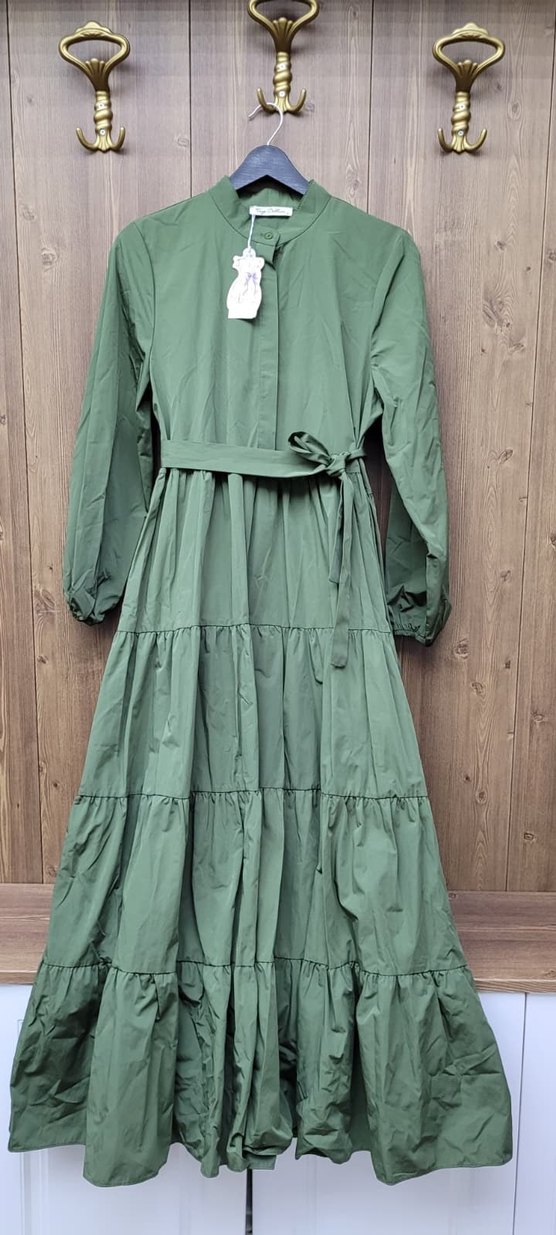 Düğmeli, uzun saten görünümlü haki kat kat elbiseNotlu yaka ve uzun kollu, günlük kullanıma uygun rahat kesim. markası (terzi dukkani) lutfen siteye girip o markaya bakınız en kalitesiz elbiseleri bile 3000 tl den assagı degil
