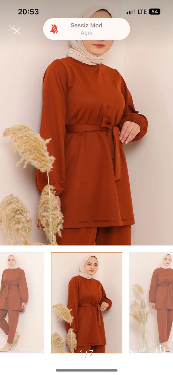 Kahverengi, kemerli, uzun kollu ve yüksek yakalı mini kadın takımı. Rahat kesimi ve yumuşak sentetik kumaşıyla günlük kullanıma uygundur.