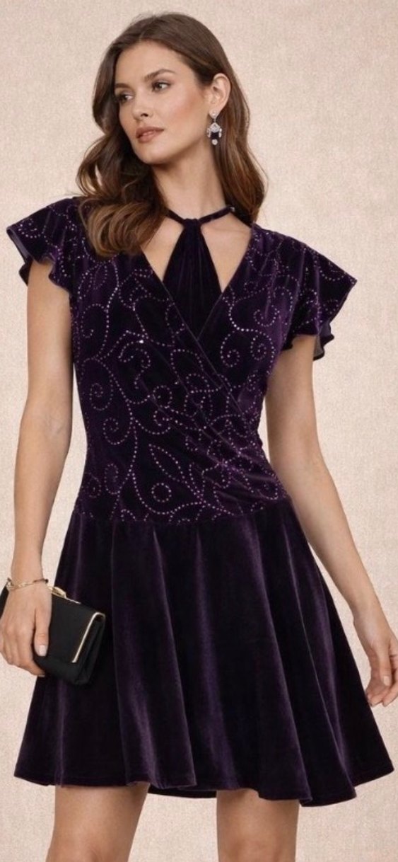 Etiketli, Mor renk, boyundan askılı ve kısa kollu kadife elbise. Marka temsilidir. Yapay zeka ile giydirilmiştir.