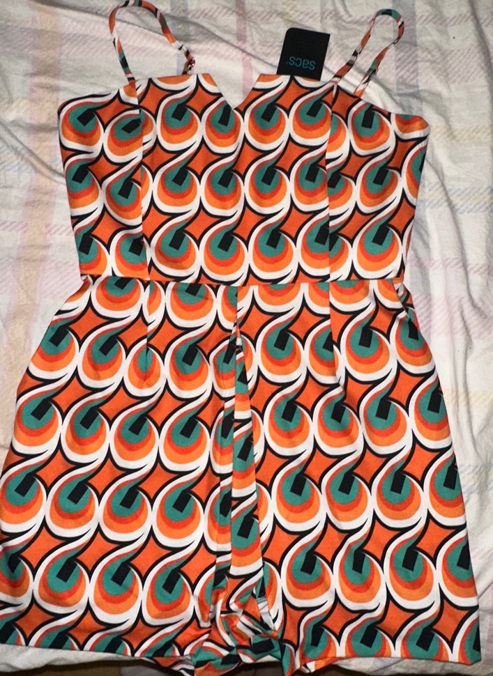 Rengârenk, retro desenli çok tatlı bir tulum. Etiketi üzerinde, hiç giyilmedi. Kumaşı yumuşak ve kaliteli, yazlık–baharlık kombinlere aşırı yakışıyor. Gerçekten çok enerjik bir parça, fotoğraftakinden daha canlı duruyor. Dolapta beklediği için satıyorum. • Beden: L • Durum: Sıfır (etiketli) • İç şortu var, kesinlikle göstermiyor • Rahat kesim, gün boyu kullanılabilir Fiyat makuldür, ufak bir pazarlık olabilir.