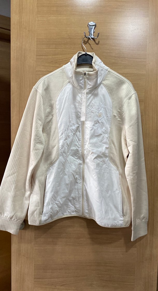 Beyaz renkte, yüksek yakalı ve uzun kollu spor ceketi. Fermuarlı önde, sentetik kumaştan ve normal kesimdir. Trendy gündelik ve sokak stili için uygundur.