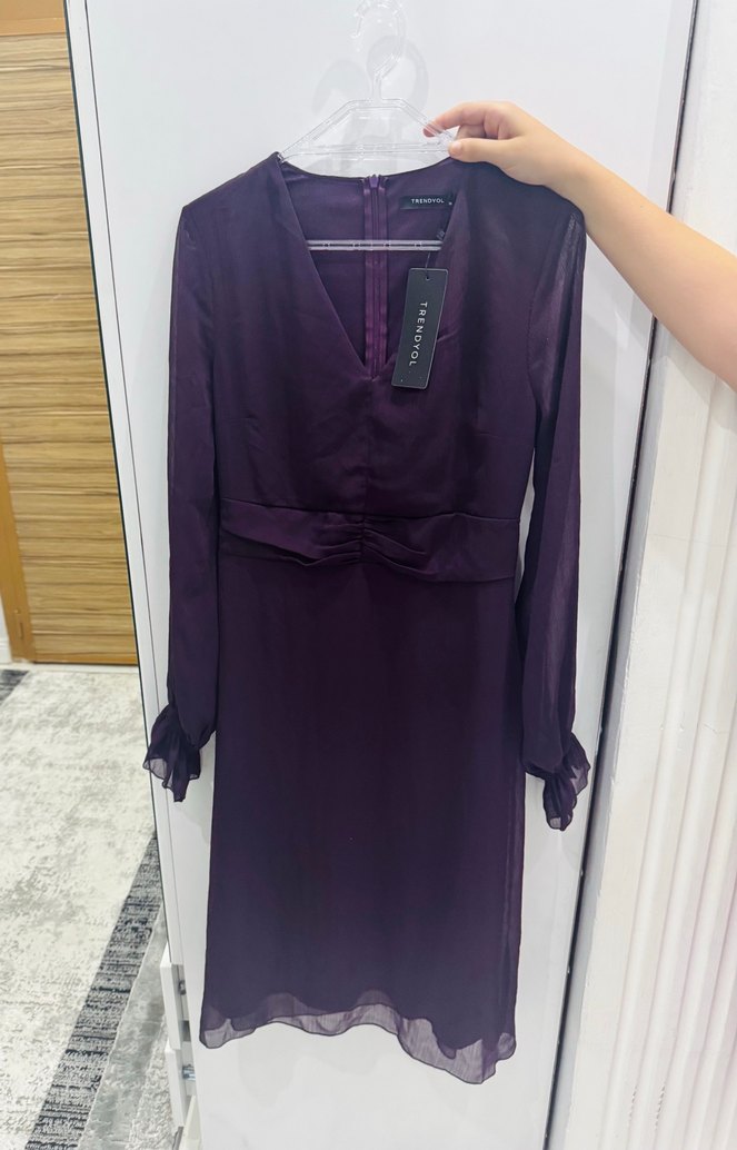 Uzun kollu, V yaka, mor midi elbise. İnce ve drapeli yapısıyla modern klasik ofis stiline uygun. Yanlış beden alındığı için hiç giyilmedi etiketi üzerindedir.
