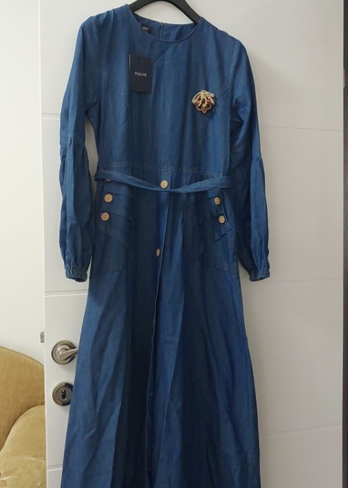 Yanlarında aktif cepleri olan süs düğmeleri bulunan kalitesi yuksek yumuşak kot arkasında fermuarı bulunan kolları lastikli ve şekilli çok şık ve rahat bir kot elbise belinde kuşağı bulunan alan kişinin çok memnun kalacağı kot elbisedir.