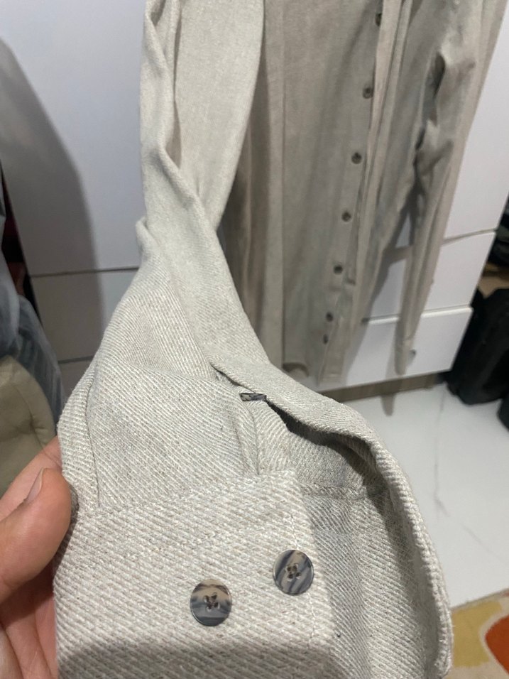 Gri keten kumaştan, düğmeli ve kesik yaka detaylı hamile ceketi. Uzun kollu, normal kesim ve midi boydadır, günlük kullanıma uygundur.