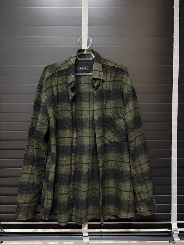 Haki renkli, kareli, oversize kesim erkek gömlek. Düğmeli, uzun kollu