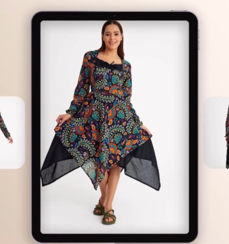 Bohem tarzda, çok renkli bağlama desenli, uzun ve salaş kesim elbise. Uzun kollu, V yaka ve drapeli etek uçlarına sahiptir.