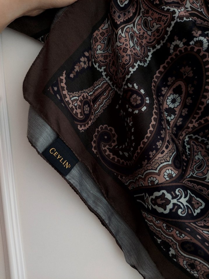 Koyu kahverengi, ipeksi dokulu, drapeli kadın şalı. Bohem tarzda desenlere sahip, üzerinde "CEYLIN" etiketi bulunur.