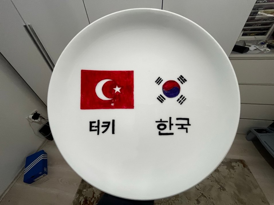 Türk ve kore bayraklı beyaz porselen tabak