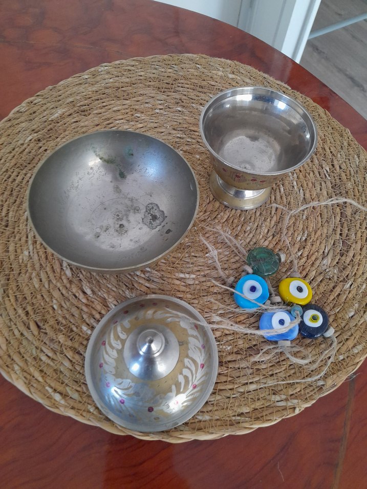 Bohem tarzda, etnik desenli gri ve turkuaz renklerde tabak seti. Kase, kapaklı tabak ve renkli küçük dekoratif parçalar içerir. ️