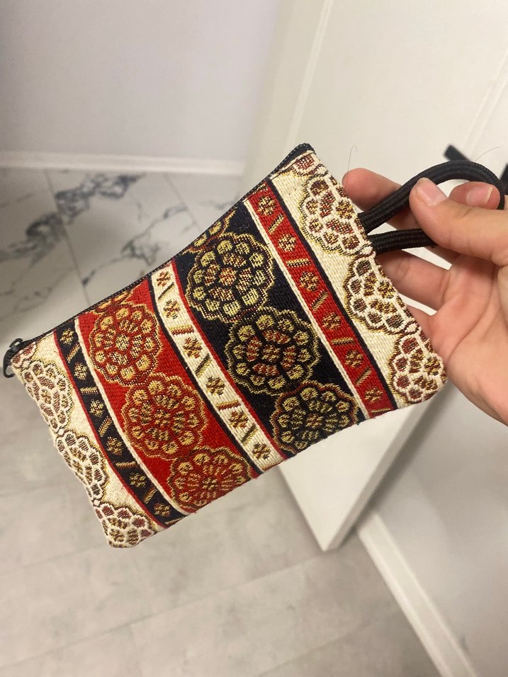 Tekstil malzemeden yapılmış, fermuarlı, koyu renkli çok renkli etnik desenli bohem ve retro tarzda kadın portföy çanta.