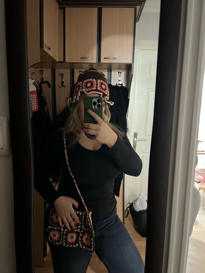 Etnik desenli, tokalı örgü çanta, günlük kullanıma uygun bohem sokak tarzı ile uyumlu.