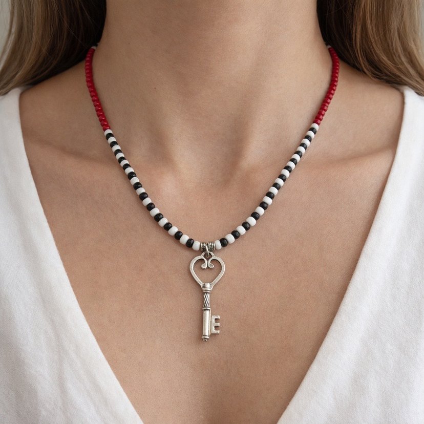 Kırmızı, siyah ve beyaz boncuklardan oluşan renkli etnik desenli kolye, gümüş renk anahtar kolye ucu ile günlük kullanıma uygun bohem tarz sunar. 42cm. Uzatma zinciri mevcut N10