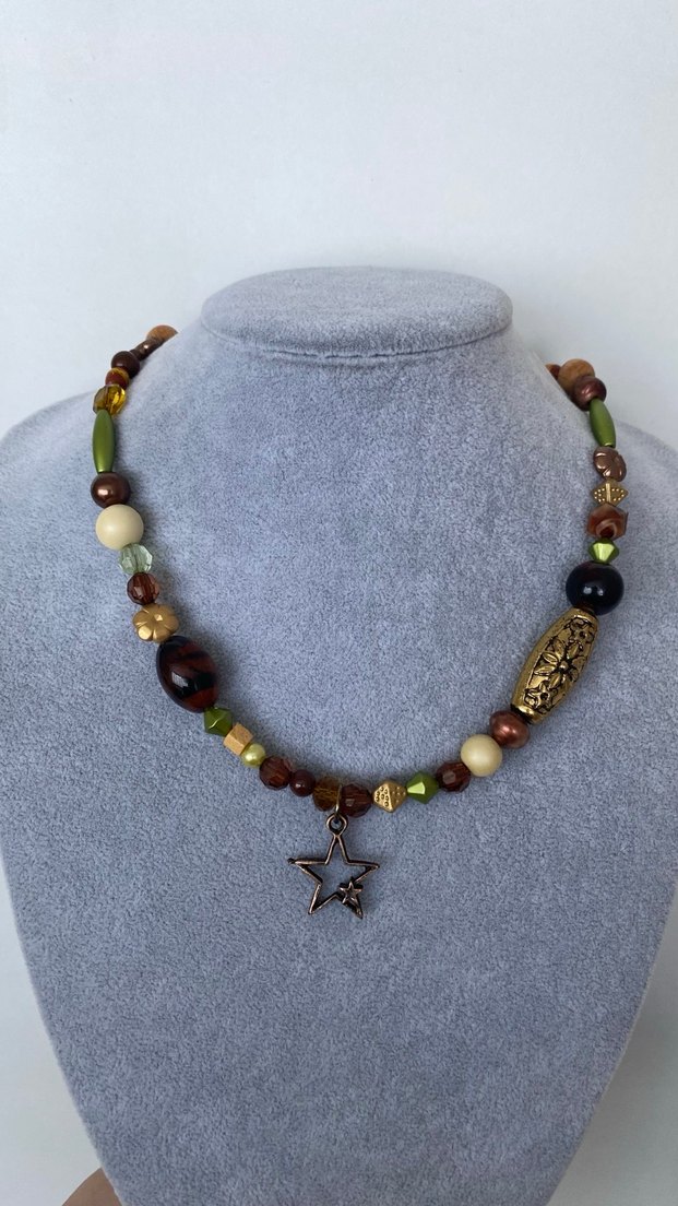 Bohem tarzda, kahverengi ve yeşil boncuklardan oluşan etnik desenli kolye. Orta uzunlukta ve yıldız figürlü kolye, romantik akşamlar için ideal.