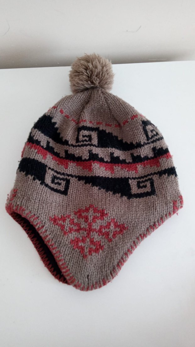 Etnik desenli, kahverengi ve gri renklerde, ponponlu çocuk örgü bere. Kulakları kapatan yapısıyla ekstra koruma sağlar.