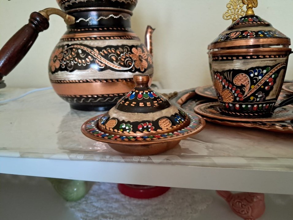 Koyu renkli, çok renkli bakır tabak etnik desenlerle süslenmiş, geleneksel bir dokunuş sunar. ️ tüm set olarak satıyorum ayrı ayrı da alabilirsiniz