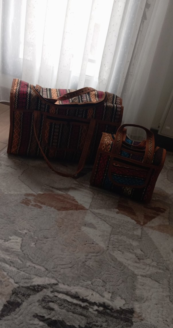 Koyu renkli, çok renkli etnik desenli bebek çantası seti, geniş bölmeler ve sağlam saplara sahiptir. Bebek eşyaları için uygundur.
