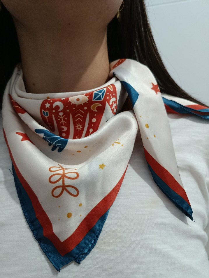Etnik desenli, ipek görünümlü fular bohem ve retro sokak stiliyle boyunda drapelenmiş.