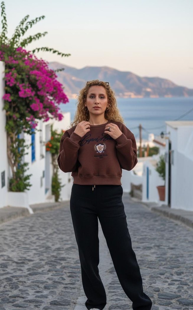 Kahverengi, etnik desenli, oversize kesim sweatshirt. Uzun kollu ve yuvarlak yakalı, dış mekan kullanımı için uygun yumuşak kumaş.S-M-L bedenleri mevcuttur