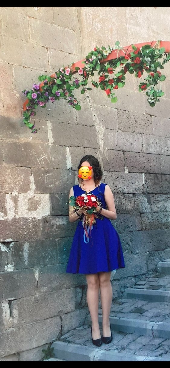 Bu mavi, etnik desenli ve drapeli, straplez midi elbise, dar kesim ve kolsuzdur. Düğün ve mezuniyet için uygundur.