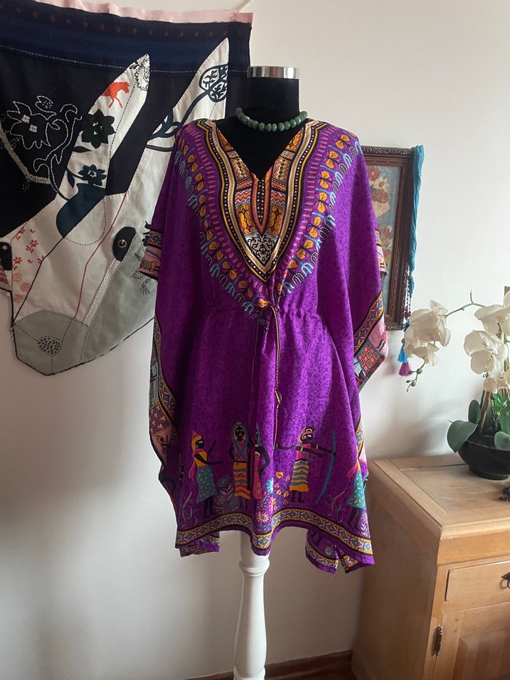 Renkli etnik desenli, dökümlü, uzun boy, mor tunik. V yaka ve kısa kollu, rahat bol kesim günlük kullanım için uygun. Hindistan İpek’i plaj elbisesi iki kol arası 65 santim boy 90 santim kesik