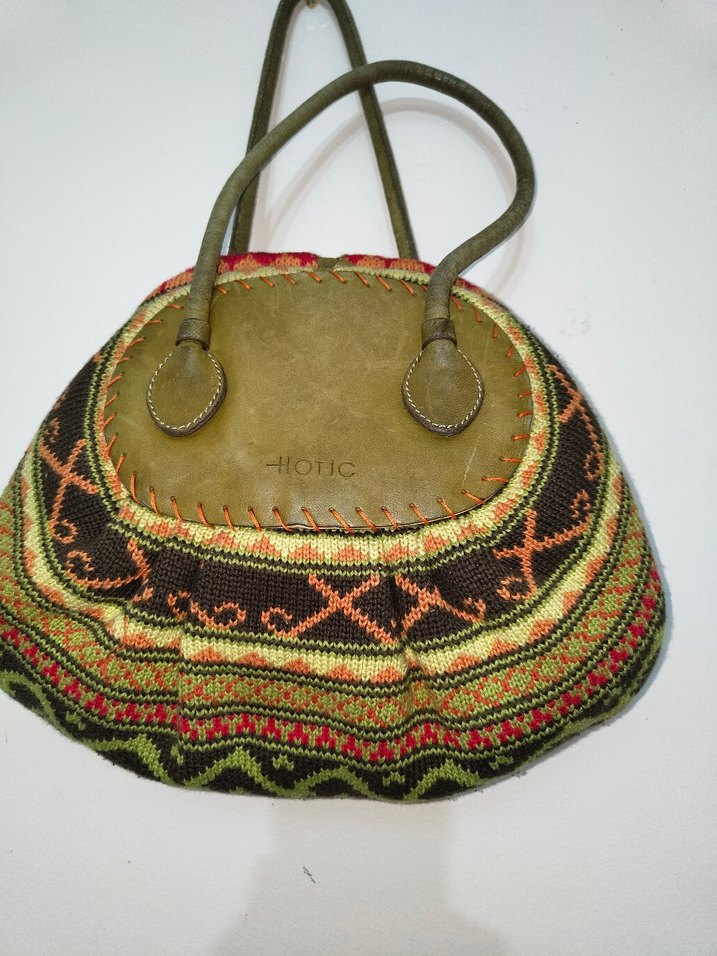 Kadın çantası, renkli etnik desenli örgü yapıya ve haki detaylara sahip, bohem tarzı yansıtıyor. Günlük kullanıma uygundur.