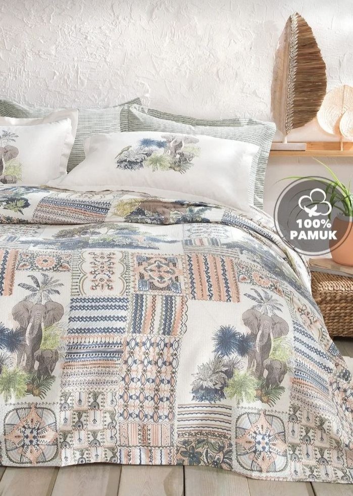 Etnik desenli, pastel renklere sahip bu pike takımı %100 pamuktan üretilmiştir ve rahat bir uyku ortamı sağlar.