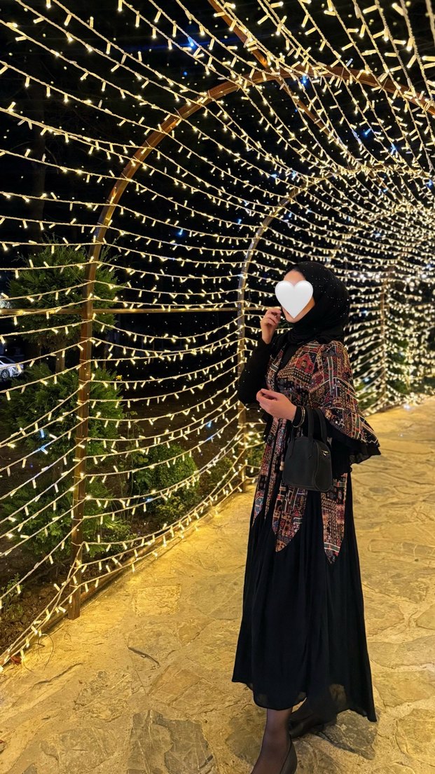 Siyah uzun elbise, yüksek yakalı, uzun kollu, etnik desenli ve püsküllü, sentetik kumaştan üretilmiş bol kesimdir.