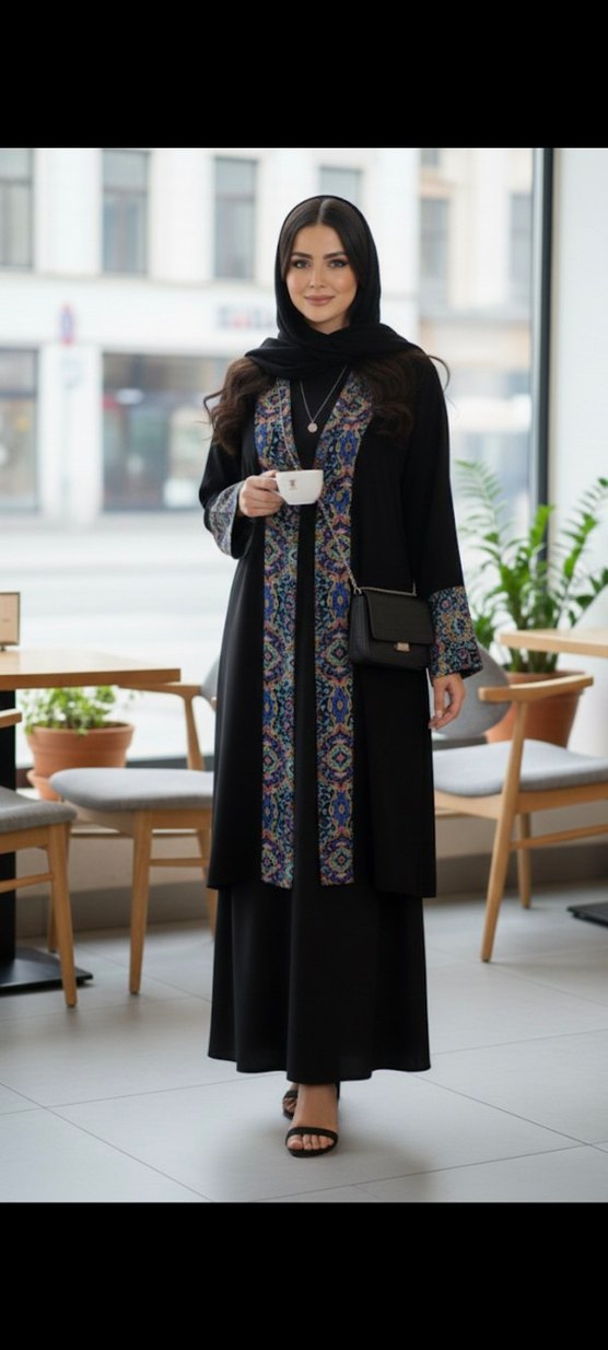 Uzun siyah elbise, etnik desenli ön ve kol manşetleriyle dikkat çeker. Notlu yaka, uzun kollu ve kemerli, rahat kesimdir.