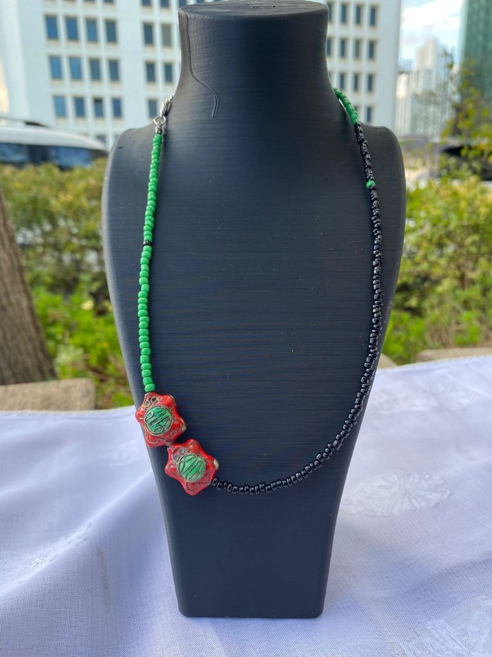 El Yapımı Etnik Desenli Siyah Yeşil Boncuklu Kolye