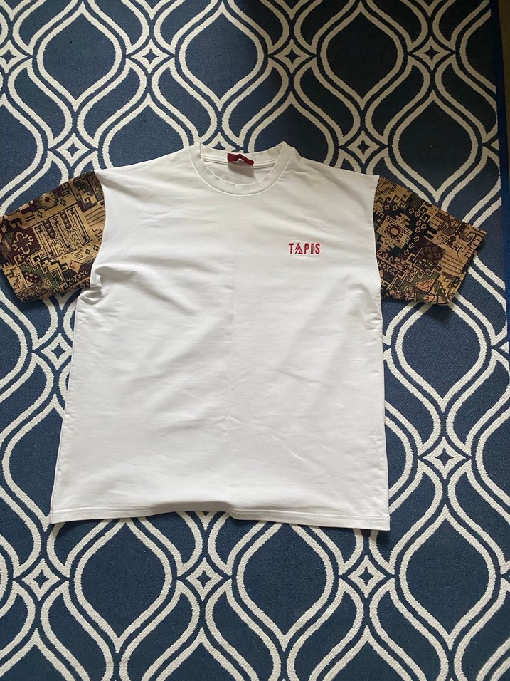 Beyaz gövde ve desenli kısa kollara sahip, drapeli ve bol kesim erkek T-shirt. Yuvarlak yaka ve göğüste "TAPIS" nakış detayı bulunur.