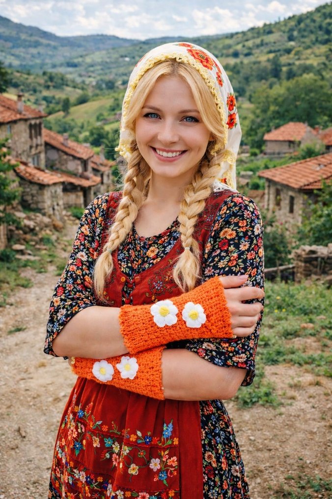 Renkli turuncu örgü kız eldivenleri, etnik desenler ve papatya detaylarıyla bohem tarzı yansıtır. Retro ve hippie havası katar.