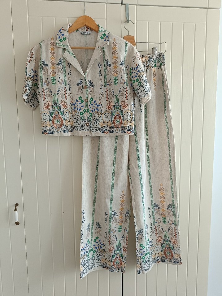 Bu takım, kısa kollu ve bol kesim üst ile uzun paça pantolondan oluşur. Açık renkli kumaş üzerinde çok renkli desenler bulunur. Bedeni S yazıyor ama bana biraz bol geldi, S-M arasına daha uygun. Ölçüleri Pantolon için; bel esnetilmemiş halde 33 cm, ağ yerinden basen 30 cm, boy 106 cm, paça genişliği 27 cm. Üst için iki kol arası 49 cm, boy 44 cm ve kol boyu 19 cm. Bir ya da iki kez giyildi.