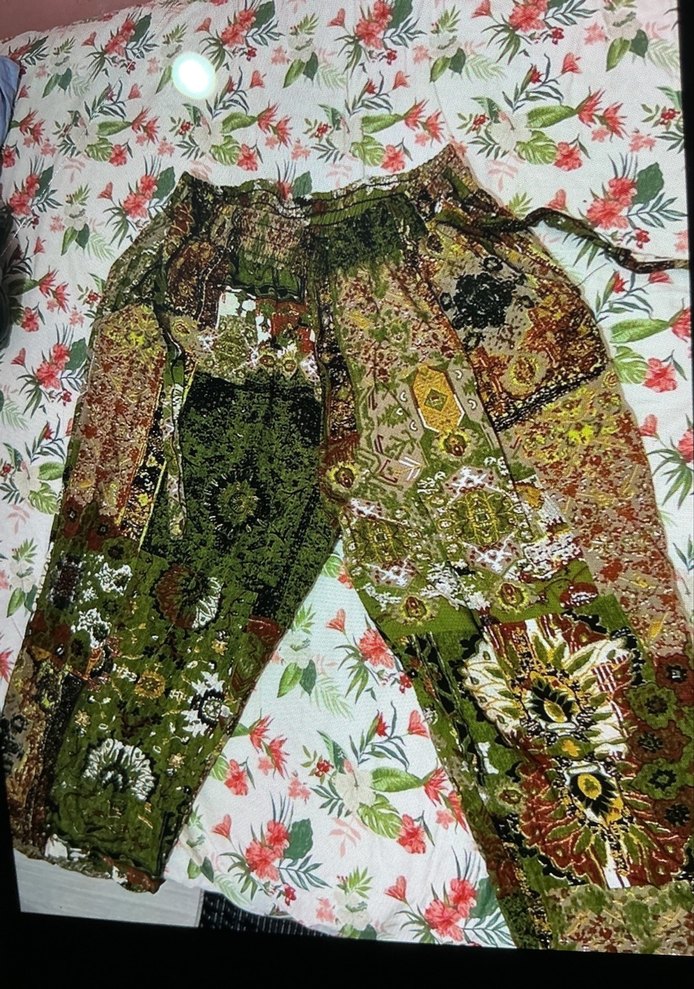 Düğmeli, uzun ve bol kesim kadın pantolon, çok renkli bohem desenlerle yumuşak kumaştan üretilmiştir, günlük kullanım için uygundur.