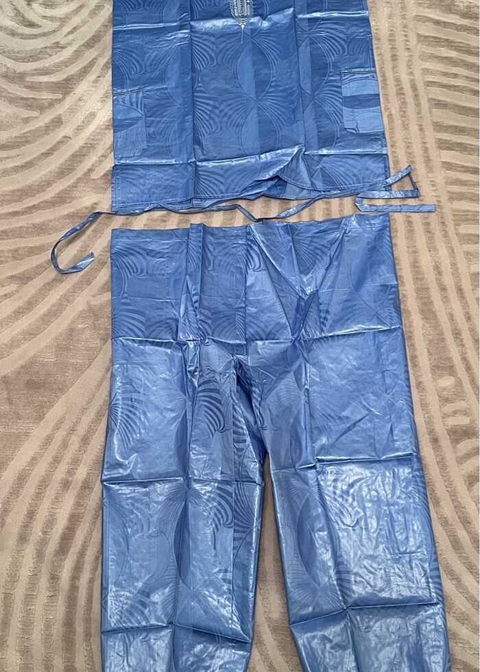 Afrika yöresel giysi, yakası işlemeli, el yapımı olduğu için etiketi yok. Pantolonun beli ipli ama lastik takılabilir.