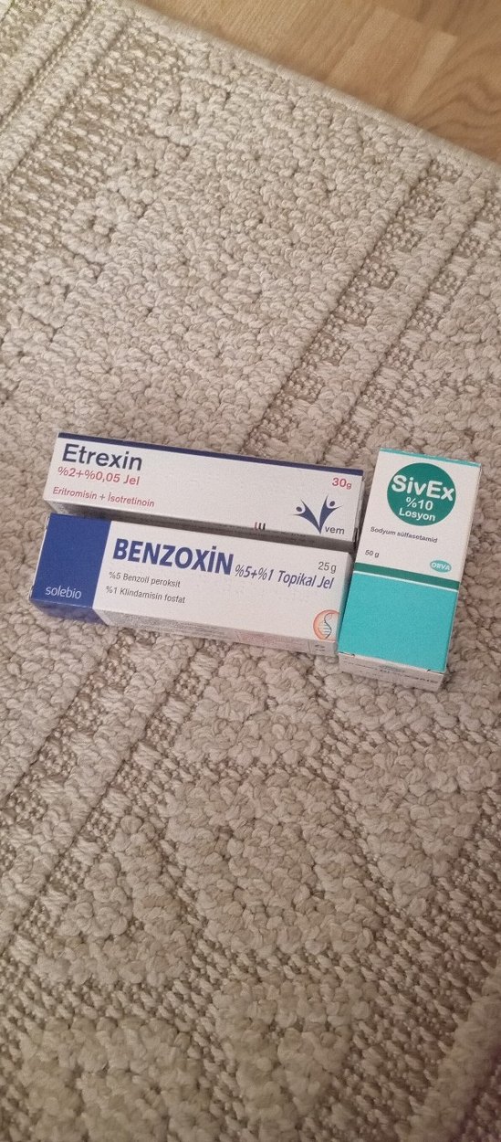 Etrexin jel %0,05 isotretinoin ve %2 eritromisin, Benzoxin jel %5 benzoyl peroksit ve %1 klindamisin fosfat, SivEx losyon %10 sodyum sulfasetamid içerir. Topikal kullanım içindir.(sivex jel yarısi duruyor tahminen benzoxin bir kez noktasal uygulandı tam dolu göründüğü gibi.etrexinde yarıdan fazlası duruyor