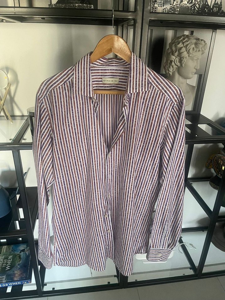 Uzun kollu, yakalı ve düğmeli pamuklu erkek gömleği. Bordo çizgili deseniyle ofis kullanımı için uygundur. Orjinal Etro nun en cok tercih edilen uzun kollu gomleklerinden birisi. Hediye geldi, tarzim olmadigindan dolayi hic giymedim, urun sifirdir hatasizdir ve defo yoktur. Cizgili ve renkli detay hakimdir.42 beden diye geciyor L ye denk geliyor.En 21 cm- boy 29cm - omuz kol uzunluk 26cm