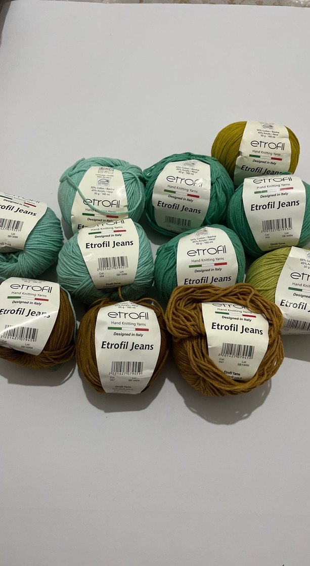 Çeşitli renklerde Etrofil Jeans el örgü ipliği seti, bohem tarzda el işleri için uygundur. İtalya'da tasarlanmıştır.