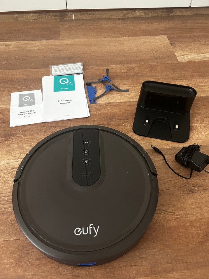 Koyu gri renkte Eufy robot süpürge, şarj istasyonu, yan fırçalar, güç adaptörü ve kullanım kılavuzları birlikte. yedek fırçaları ve yedek filtresi de duruyor. Birkaç sene kullanıldı. Kalorifer altlarına girdiği için çizildi bazı yerleri başka hiçbir sorunu yok. Kumandası da bulunuyor Anker Eufy RoboVac 15T Akıllı Robot Süpürge 3 Noktalı Temizleme Sistemi Üç fırça ve yüksek emiş gücü, üstün bir temizlik sağlamak için kiri etkili bir şekilde gevşetir, çeker ve vakumlar. Süper Güçlü Emiş RoboVac 15T, görebileceğiniz ve hissedebileceğiniz lekesiz bir temizlik için 1500 Pa emiş gücü ile kiri ve tozu emer. Üçlü Filtre Sistemi RoboVac, temiz bir ev sağlamak için çift katmanlı bir filtre ile yüksek performanslı bir filtreyi birleştirir.