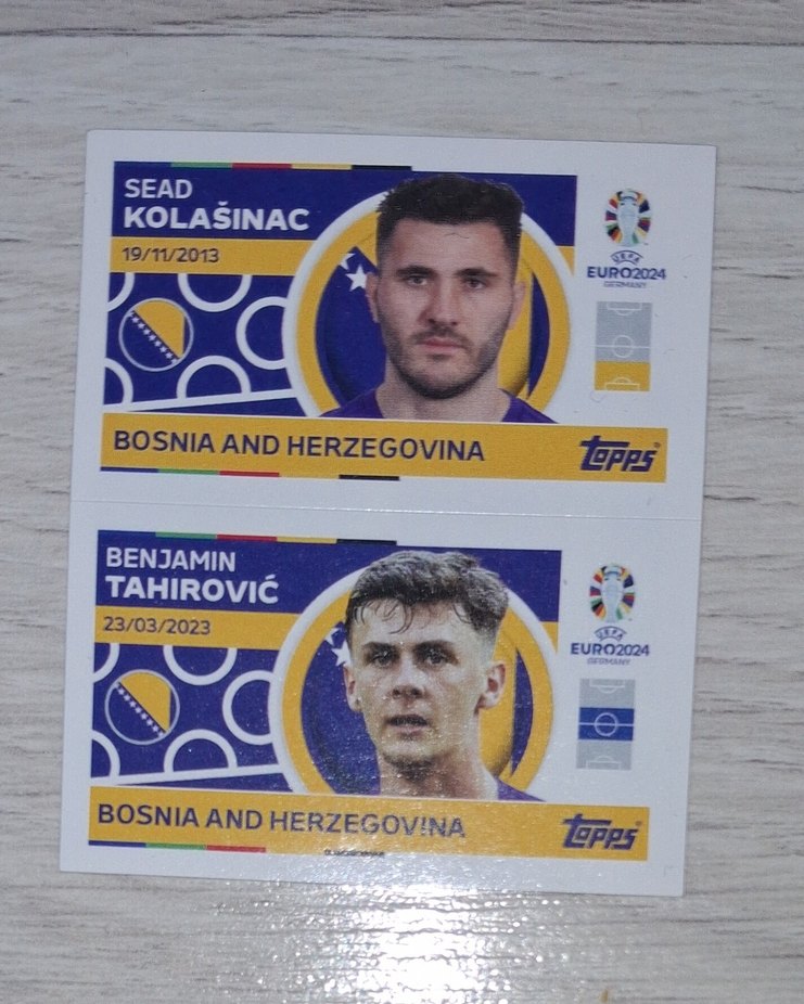 EURO 2024 koleksiyonundan Topps markalı orijinal, Bosna Hersekli futbolcular Sead Kolašinac ve Benjamin Tahirović'in sticker kartları.Buluşup almak isterseniz sahibinden hesabımdan 10 Tl'ye alabilirsiniz isteyenlere hesabı atarım.