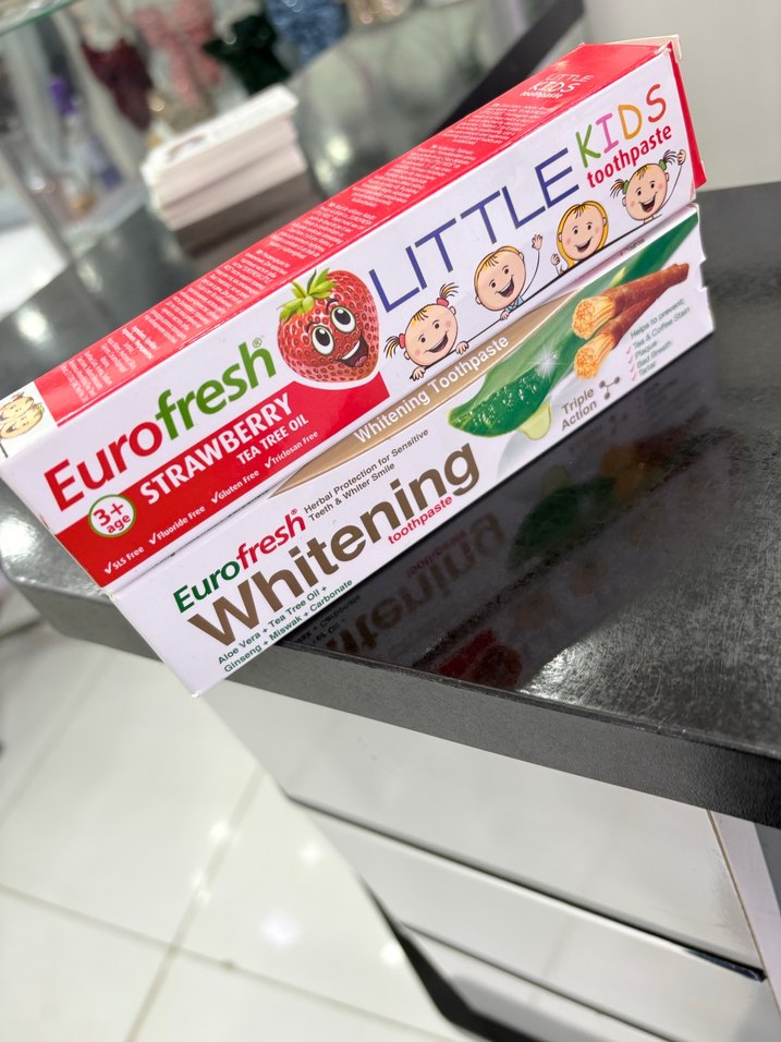 Eurofresh çilek aromalı çocuk diş macunu, çay ağacı yağı ile hafif beyazlatma ve ağız bakımı sağlar. 3 yaş ve üzeri çocuklar için uygundur. İkisinin fiyatıdır