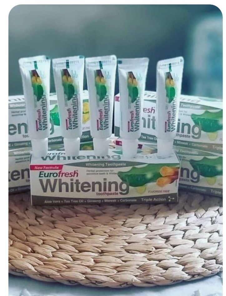Eurofresh Whitening diş macunu seti, aloe vera, çay ağacı yağı ve nane içerir. Florür ve karbamid ile üçlü etki sağlar.