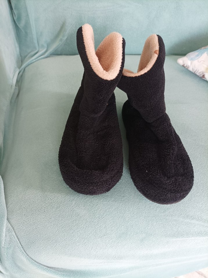 Kızlar için siyah, yumuşak ve sıcak kumaştan yapılmış, kolay giyilebilen velcro kapamalı terlikler. Desensiz ve sade normcore tarzda.