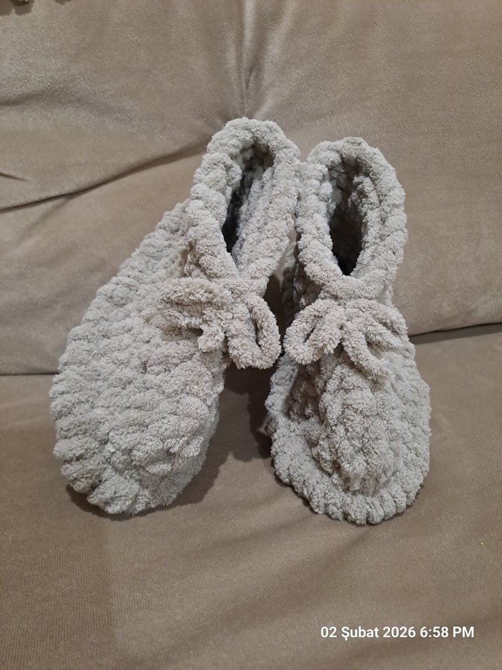 el emeği 36-38 numaralara uygundur. sıcacık tutar, içi keçe alt kısmı ise suni deri olan özel tabanlık üzerine örülmüştür.