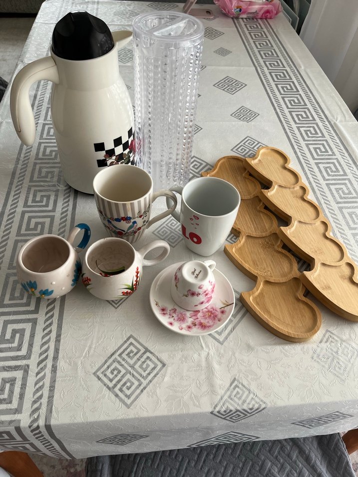 Beyaz termos, şeffaf bardak, desenli çay fincanları ve ahşap servis tabaklarından oluşan set. Fincanlar çiçek ve renkli desenlere sahip. ☕fincanın bir ucunda çatlak var bir tanesinde görselde cektim termosta basma ucu yok ev taşırken eşyaların içine koymustum bulursam koyarım