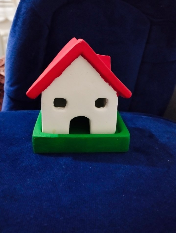 Kırmızı çatılı, yeşil tabanlı beyaz ev figürü. Kare pencereler ve kemerli kapı detayına sahiptir. Ev mumluk tütsülük