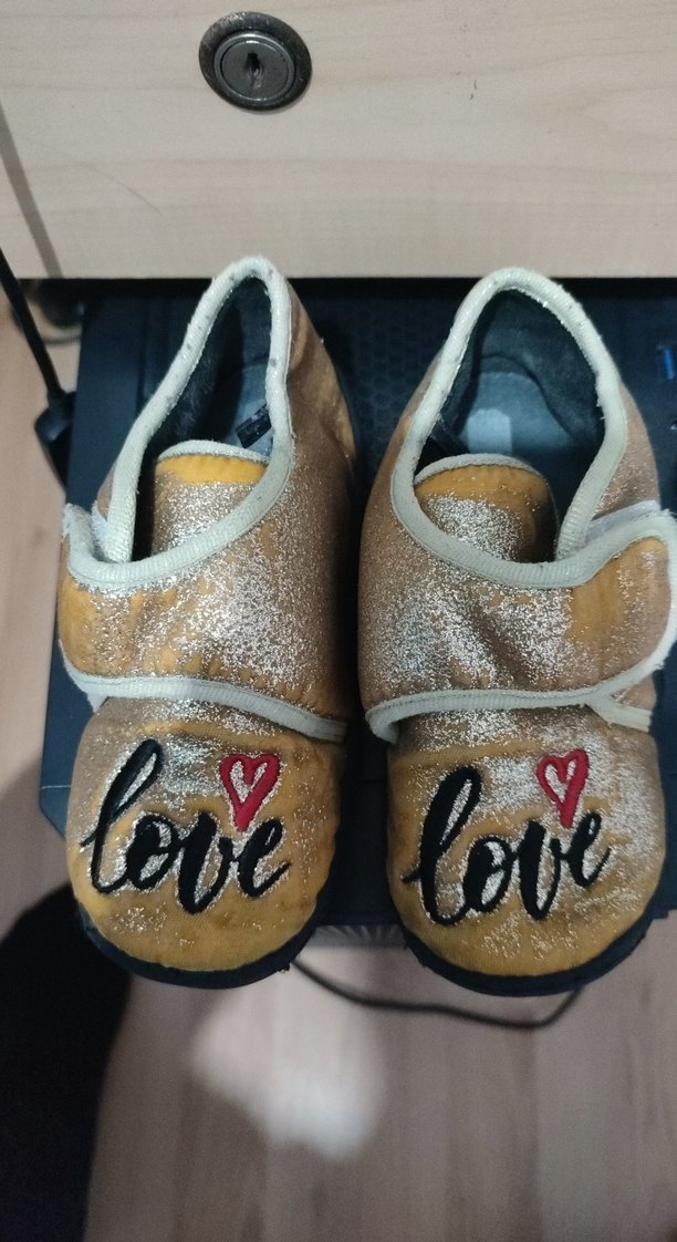 Fırat step love yazısı ve kalp desenli, altın renkli kız ayakkabisi. Kauçuk tabanlı ve ayarlanabilir cırt cırtlıdır, rahat ve sokak modasına uygundur. dış yuzeydeki sim benzeri kısımlar döküldü onun dışında sökük yırtık yok