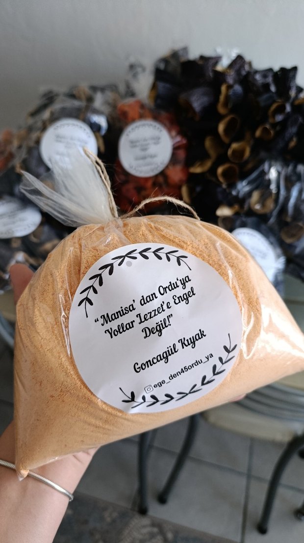 Üzerinde Türkçe yazılı etiket bulunan, bağlamalı şeffaf poşette açık ev yapımı doğal tarhana